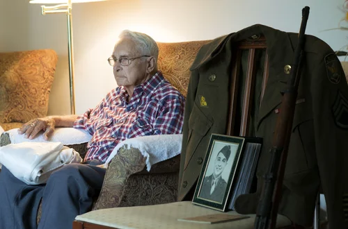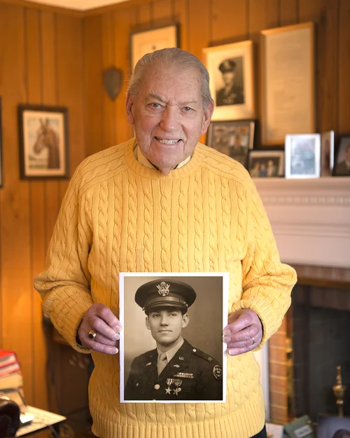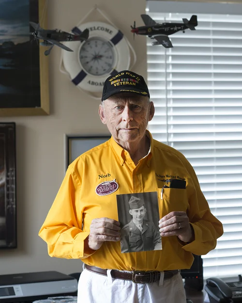 93 year old Herbert Humphries was a Staff Sergeant and Army Medic in the 26th Signal Construction Brigade, Medical Detachment. He landed in Normandy on DDAY + 14 and remembers being quickly engaged with the Germans in the Normandy countryside. "I was running across all of these open fields and bullets were flying overhead, but I was never hit. I was picking up wounded and dead army guys, sticking them with shots and bandaging up their bullet wounds." He remembers the fighting was grim and he wondered why the hell he was even in the Army. "I was drafted, I didn't volunteer."