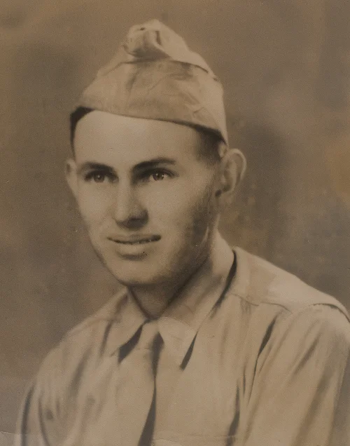 During the ship ride home we were thinking how exciting it would be to be in New York! Oh Boy! But once we got out to sea, the captain came over the loud speaker and said we are not going right to New York, we have cargo for the Port of Spain in Trinidad. Now we knew about “Rum and Coca Cola! Working for the Yankee Dollar!” So we thought, “Oh boy, we’ll be in paradise!” The boat arrived at the port and the captain got on and said if you think I’m going to turn 1,000 prisoners of war loose in the Port of Spain, think again, I’d never get you back on! So we stayed on that ship. The weather was tropical, so we were all down to our shorts. I started putting on weight because I was eating sometimes two dinners because my roommate was seasick and I also bought a box of 24 Hershey bars and a box of cigars and I fattened up. Eventually we turned around and sailed for New York and arrived on June 6, 1945. They put us in Camp Shanks, New York for one night and then we took a train the next day to Camp Atterbury in Indianapolis, Indiana, got paid and came home. I was home on R&R and received orders in September to report to Boca Raton, Florida. That’s a resort! Oh man! Well, two days before I was supposed to leave, I got a telegram saying “Do Not Report to Boca Raton. Report to Kelly Field San Antonio, Texas.” Another fella and I were traveling together in a car. We had to get a tire replaced somewhere on the way down there and the car dealer said “Don’t you know there’s a war going on?” We said, “Look! This is what we are, we’ve got these orders, do you want to fight the Army?” *laughs*