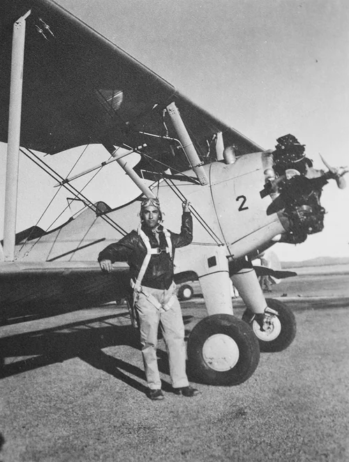 Herb during training standing next to the Stearman PT-17
