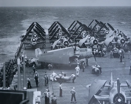 Busy preparation for a combat mission on the deck of the USS Hornet, the carrier Ken's squadron was assigned to.