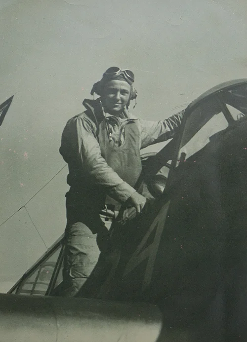 Portrait of Ken Glass standing on his TBM-3 Avenger.