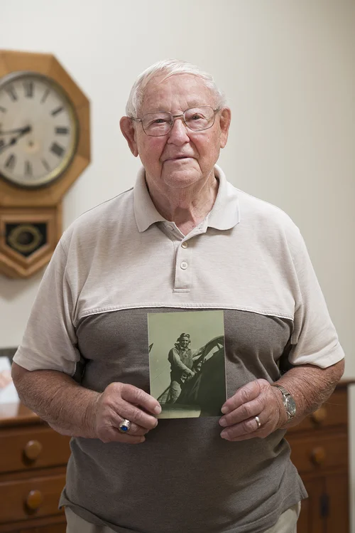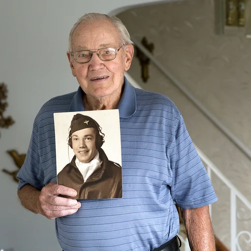I was the nose gunner and bombardier for our crew. I was up there extended out in front of the plane in a plexiglass bubble. Once we got up to ten thousand feet, we’d turn our oxygen on and get in position and stay there until we got over the target. That’s when I’d start saying a good prayer to the Lord. During the missions before and after we hit the target, there were always German fighters coming in attacking us and I would return fire, but I don’t think I ever hit any. I got to see other planes get shot down and every time I would thank God that it wasn’t me. It’s a very scary position to be in, let me tell you. I just thank the good Lord that I’m still here.