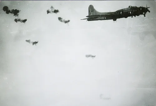 Clarence's B-17, Battlin' Butch flying through some German flak while on a combat mission over Germany