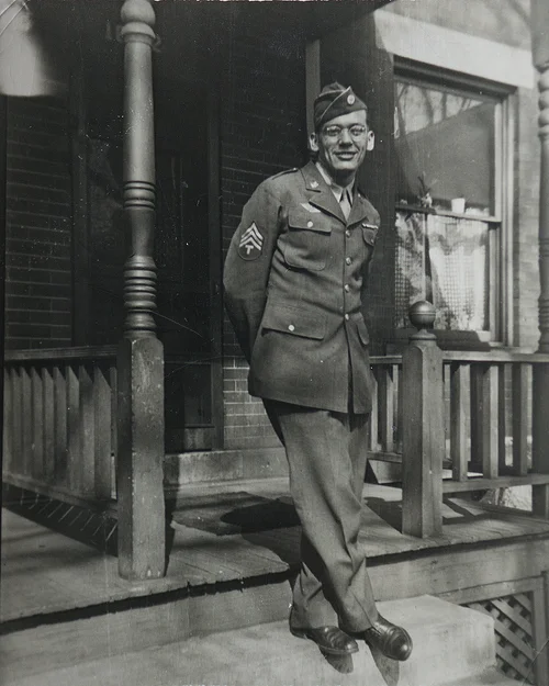 Finally we made it through that storm and on the afternoon of November 30, 1945 we docked in Newport News, Virginia, 16 days after we left Europe. It was one of those moments where you wanted to kiss the ground. That evening I called my parents and Betty Lou Hudepohl, who I was to marry, to let them know I had made it safely back to the states. Several days later, we took a train to Camp Pickett. This was to be our final Army Post before we were released back to civilian life. During the second week of December 1945, I got my clearance to return to Cincinnati. The train ride home was very very joyful and the train arrived in the Cincinnati Union Terminal. My parents and my fiancee Betty Lou were waiting for me in the terminal. It was very emotional. I was just happy to be home."