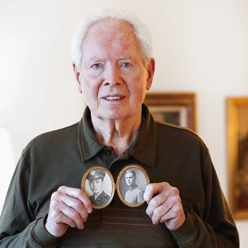 Herb in his bomber jacket and crusher cap holding his service portrait