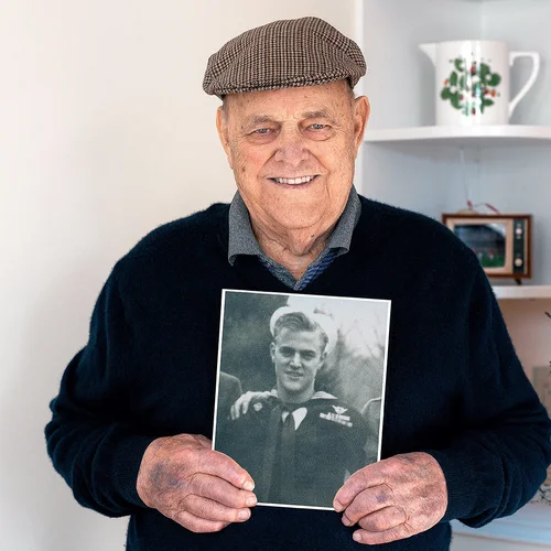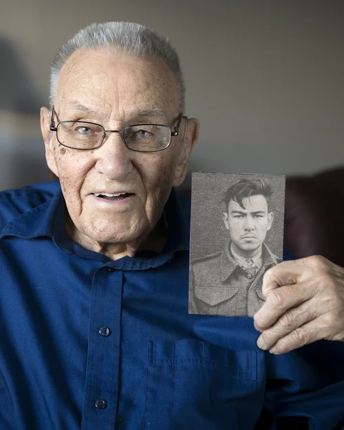 Pictured is Chester in his service jacket sharing the photo of his regiment and talking about the attack on the German pill box. Below those images is his service photograph from 1943.