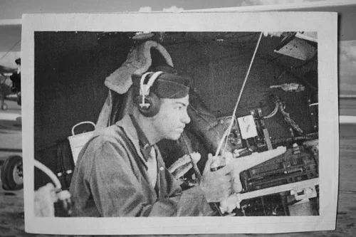 From Fort Thomas, I was sent to St. Petersburg, Florida for my basic training. Basic training at that time consisted of 6 weeks of close order drill, learning to use a rifle, taking orders and being something other than a mommas boy because they were cutting the strings from all of us country boys to become soldiers. After I was there for about a week, I was called to the officer’s quarters and they said would you like to be a pilot? I said, “Oh yes, that’s my desire, I really want to be a pilot!” And that’s what I wanted to be, I wanted to be an aviator. They put me through a mental test and a physical and in the physical they found out I was color blind again, so they washed me out. They didn’t know what to do with me because they had taken me out of basic after only a week and had told me that I didn’t need basic because I’d get all I needed in the 13 weeks of cadet school. They made me an orderly, running between different squadrons. Through being an orderly, I met a lot of people and then came my orders to go to armament school. I asked what armament school was and they said it’s where you take care of the bombs on planes and I said I didn’t want to do that. So I went to one of the officers and asked him, how I could get into photography. I had taken photography in high school and was very interested in it. He told me that it was simple and that he would write the orders for me. The orders came out and I was sent to Lowry Field in Denver, Colorado and I took the basic photography class there. Then I was called again to go to cadets. So I went and took the physical and failed again. I still don’t know why they couldn’t figure things out when I kept failing the colorblind test. I told them that I knew colors and asked them to show me colors and I would tell them what they were. They gave me a tear drop test and I passed it and was told that I could go to cadets, but then I found out that my tonsils were bad and would need to be removed first. At this time I was 19 years old. Thirty days had lapsed, which meant I had to go through the physical again and once again I flunked the colorblind test. When I got out of photo school I was promoted to a P.F.C.