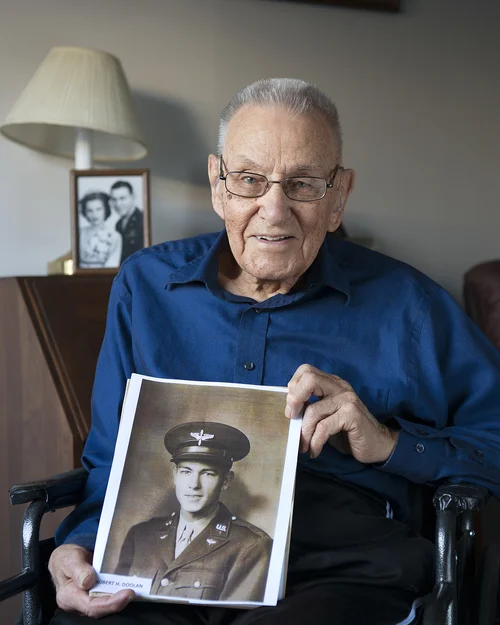 I was 10 years old when Lindburg made his flight across the ocean and from then on I wanted to fly more than anything else. Unfortunately at that time you had to have some college education to get into the Army Air Corps. In 1940, this rule was relaxed and you could substitute an equivalent written exam, so I took that exam and on August 20, 1941 I left Cincinnati on a train. Four days later I was in Tulare, California, a beautiful little town in the San Joaquin Valley, east of Fresno. I soloed rather quickly, after about 6 hours, and I thought I was doing well, except as training got more complicated, I was not proficient. I couldn’t make the cut after 10 weeks. So at that time, luckily enough, I had a contract with the Army where they couldn’t just put me into another field, so I was allowed to go home. After Pearl Harbor was attacked, I reenlisted to be a navigator. On March 30, 1942, I went through basic again and was sent to navigation school in Monroe, Louisiana. It was a brand new school. I graduated as a 2nd Lieutenant on December 26, 1942. I was assigned to a 10 man B-17 crew and we started flying and practicing formation and bombing. After our training was nearly finished in the states, we were going to Salina, Kansas to pick up a new B-17 at Smoky Hill Air Base. My pilot had gone to college in Kansas and a girl he knew in college was working at the air base. So he called her and told her to come meet us at the Officer’s PX. She didn’t want to come alone so she brought along a friend of hers who also worked at the air base. Her friend was a petite blonde and she and I talked. I asked her, “If I call you up would you want to have a date?” By this time she said she was fed up with men because this was a town with 20,000 people. There was an air base with 5,000 young fliers here, there was an infantry base with 15,000 soldiers over there. She couldn’t walk on the streets because there’d be 5 or 6 soldiers trying to get her attention. But I took a cab out to her house and we had a couple of dates, that’s all and my crew left for Europe. I corresponded with her from England and from Germany. Following my return from Europe when I came back from Texas, I took a Baltimore - Ohio and then Union Pacific train out to Salina, Kansas and I stayed at her house and met her family. We were just talking, it was casual. After a few days I came back to Cincinnati. At this time I was still on R&R. I went back again to visit and finally when the train conductor started calling me by name, I brought her to Cincinnati. It was a very limited courtship, we had almost no knowledge of each other at all, but on November 17, 1945 we got married. We were married 71 years.