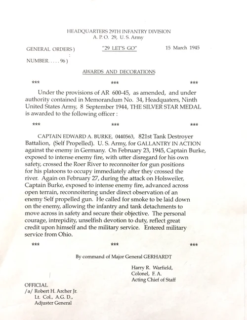 For the attack on Julich, my job was to lead the 821st Tank Destroyer Battalion across the river. The crossing was scheduled for February 23, 1945. Since I was the senior captain, I was the one to reconnoiter for my Tank Destroyers to lead the way over the pontoon bridges, which were to be erected as soon as possible. The Roer River was in flood stage. What had happened was that the German’s were trying to flood that area so we couldn’t cross to the Rhine Plain. They bombed the dam and failed, but the damage was enough to cause the water to flow out slowly, which worked to their advantage. The river was in flood stage for over a month! I didn’t know what the area was like where my tank destroyers would be advancing, so the battalion commander ordered me to go over there and reconnoiter the terrain. The pilot of our regimental plane, whom I had known since artillery school at Fort Sill back in the states and I had become good friends. I got orders to fly along the west bank to determine where the best locations would be for my M-10 Tank Destroyers to protect the infantry from German tanks. While we were flying, I could see the tank tracks in the snow and knew where the tanks were located in the forest. They were big tracks, so we knew they were Tiger and Panther tanks. I had an idea of how I wanted to get there, but I didn’t know what it was going to actually be like on land. When the time came for me to cross and scout positions, over ten thousand rounds had been fired by American Artillery. Following that, a smoke screen was fired on the east bank of the river. My job was to cross in a little row boat with two engineers who would paddle me over where I would scout locations to put my Tank Destroyers to protect soldiers of the 115th, 116th and 175th Regiments once they crossed. The bank on the east side of the river was somewhat steep which helped protect me from German fire, but they had my every move zeroed in. After studying the maps and aerial photos for the last week, I had a pretty good idea where I was located. My biggest fear was stepping on a mine. I hoped that all of the artillery that had been pounding that area had destroyed all of the mines, but you know that never happens. I couldn’t do too much walking because the law of averages would call on me to get captured or step on a mine that I couldn’t see and I couldn’t use a flashlight because I’d give away my position. My job was to determine, based on the terrain, where I could deploy my Tank Destroyers to destroy any German Tanks that would attack. I tried to follow what I thought was a beaten path somewhere along the line that may have been caused by people fishing in the river. The Germans had patrols along the bank and we had been there for over a month since the Battle of the Bulge. We had been giving them tons of fire, so I hoped the Germans had cleared out of there. As I reached the city, I saw a partially destroyed church, which reminded me of my high school days where the students prayed for the soldiers and I’m sure they were praying for me. The church gave me some protection and that’s when I saw the area where my Tank Destroyers could advance once they crossed the river. When I found the protection of the solid stone walls of the church, I regarded it as a good omen. I was particularly concerned about the slope nearby because the Germans could have guns dug in there. What I wanted to do was go around on the flank, I didn’t want to come up the hill and expose my tanks. Later on while we were attacking, one of the tanks did this and was lost. On my way back from scouting, I tried my best to retrace the steps along the same route I had advanced from The Roer River. When I got back to the river, the engineers were building a footbridge so they could get their material across to start putting together a larger pontoon bridge. The infantry would come across that foot bridge. There was a body of a soldier who had been killed as he tried to cross the bridge. I had to step over his body to get back to the west bank. After I had made it back safely, a German mortar barrage cut the footbridge in two while medics were carrying wounded across. I was later awarded the Silver Star for my crossing the Roer River under heavy artillery fire to reconnoiter positions for my tank destroyers.